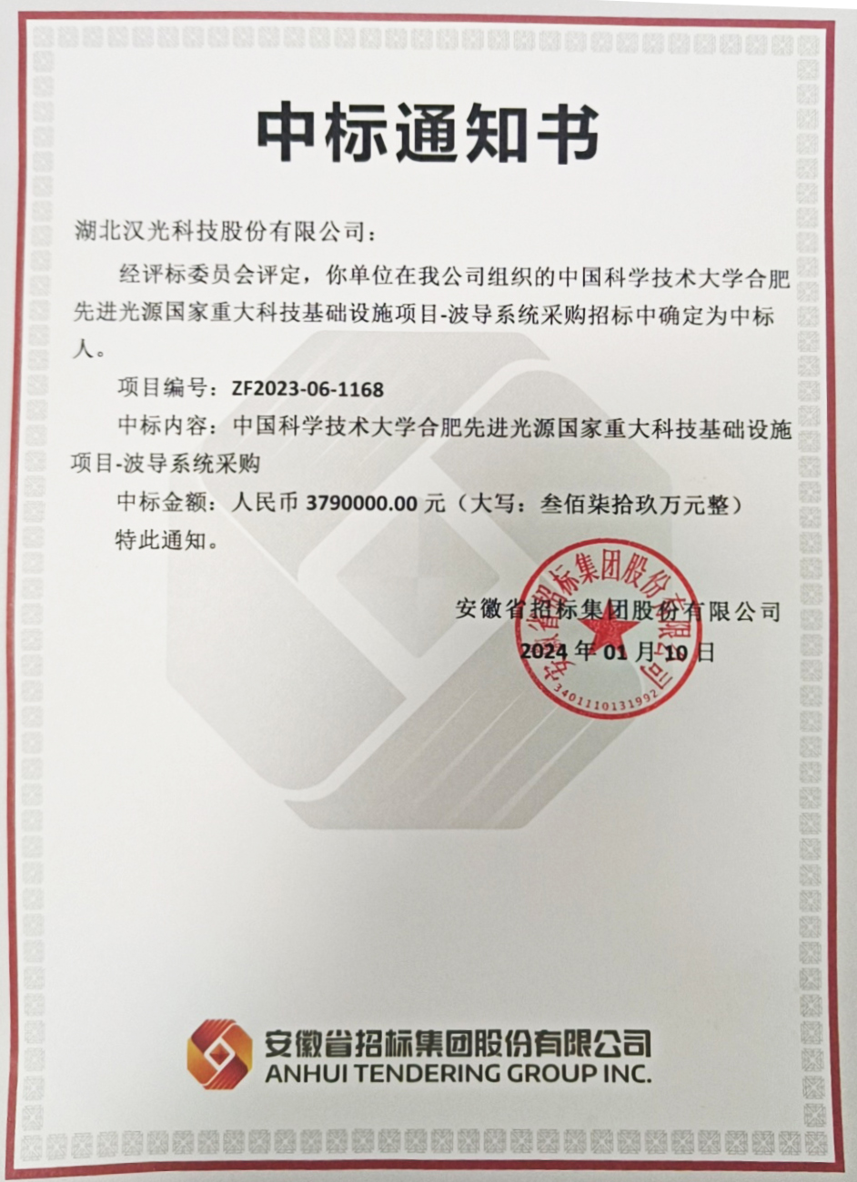 1月10日, 公司收到招標(biāo)機(jī)構(gòu)安徽省招標(biāo)集團(tuán)有限公司發(fā)出的中標(biāo)通知,公司自主研制的波導(dǎo)系統(tǒng)和干負(fù)載成功中標(biāo)中國(guó)科學(xué)技術(shù)大學(xué)合肥先進(jìn)光源國(guó)家重大科技基礎(chǔ)設(shè)施項(xiàng)目,中標(biāo)總價(jià)500余萬(wàn)元。此次中標(biāo),標(biāo)志著我公司自主研制的波導(dǎo)系統(tǒng)和干負(fù)載在國(guó)家重大科技基礎(chǔ)設(shè)施中得到進(jìn)一步廣泛應(yīng)用。