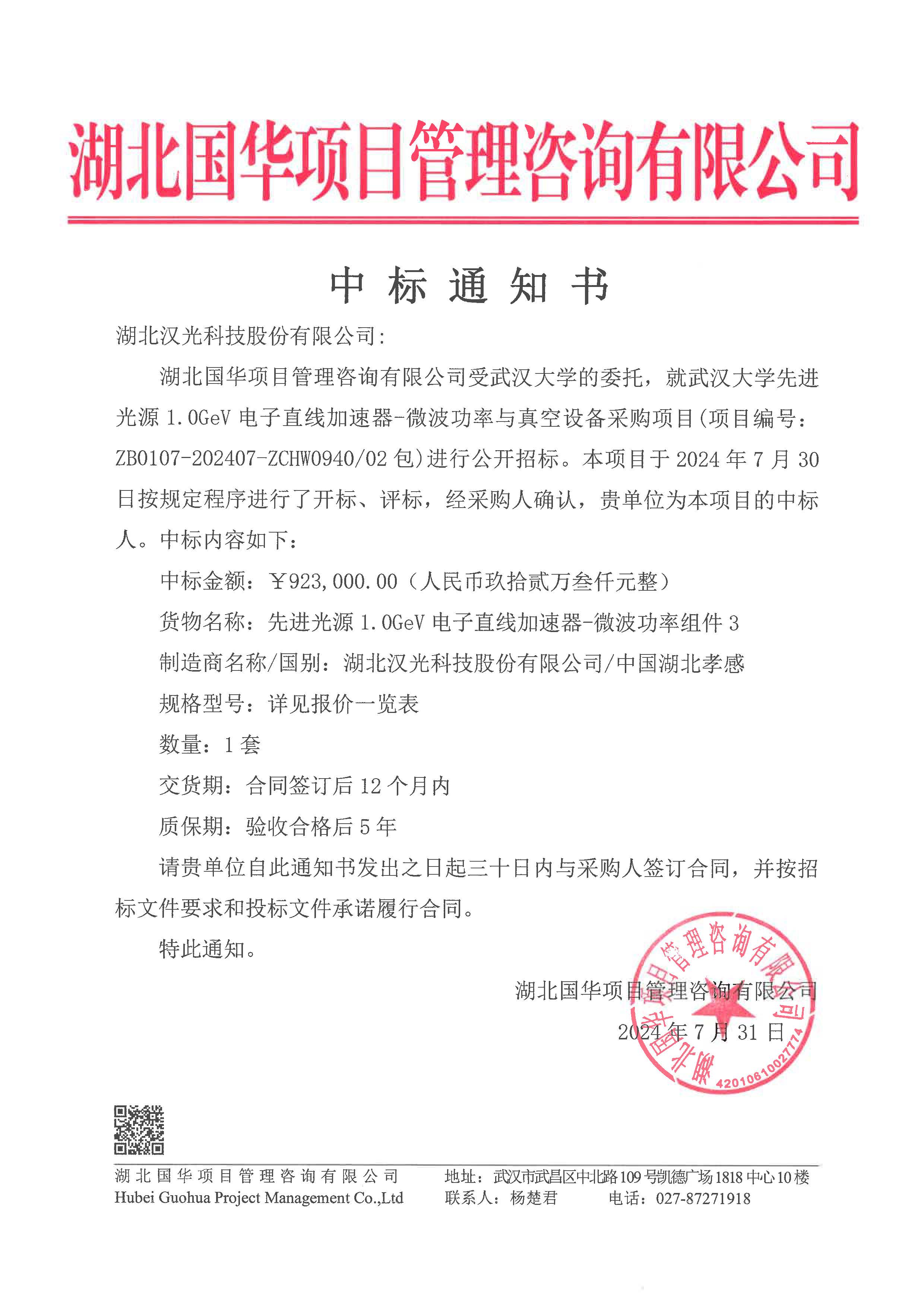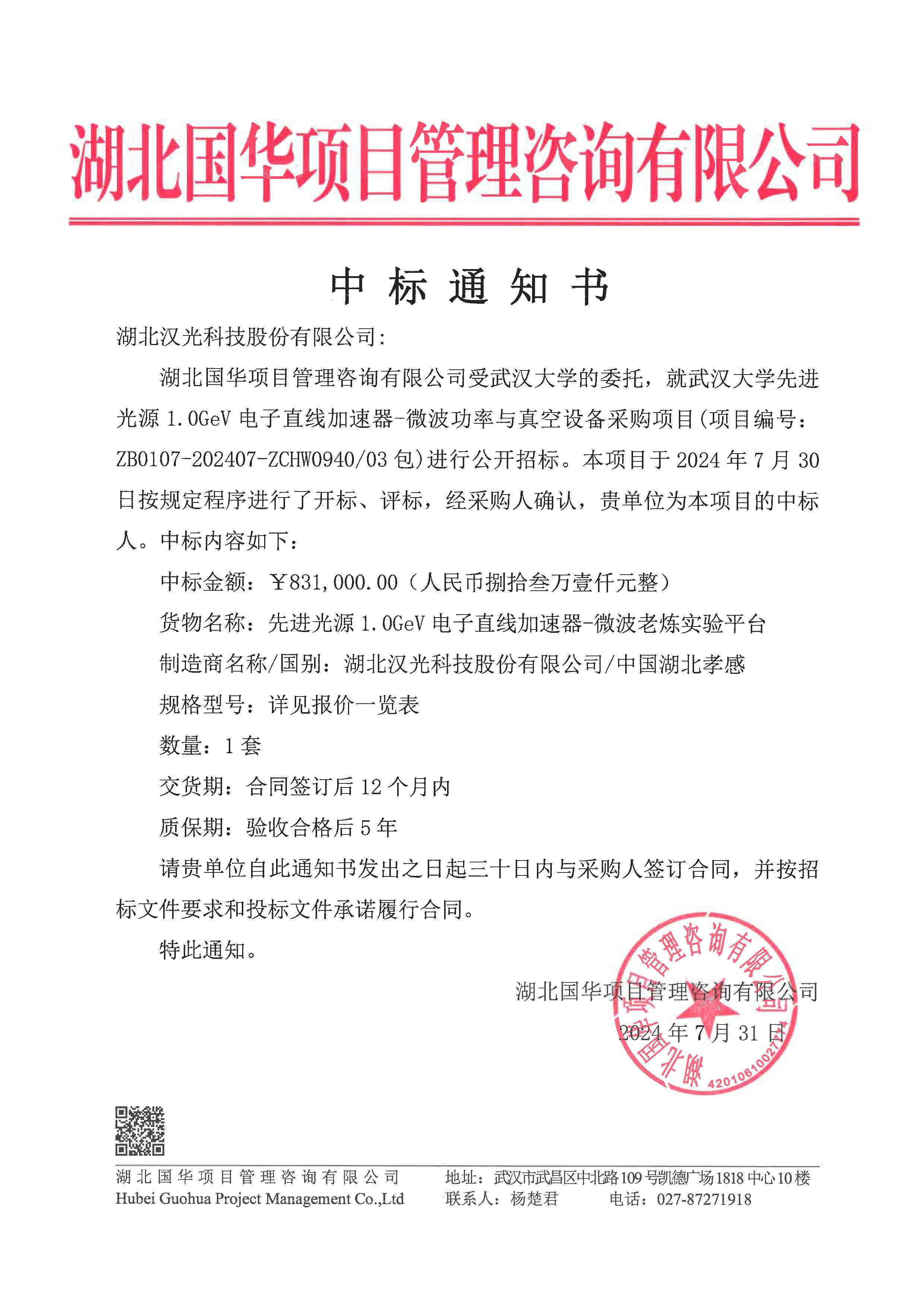 7月31日,公司收到湖北國華項目管理有限公司的中標(biāo)通知,公司自主研制的微波老煉實驗平臺、波導(dǎo)功率組件成功中標(biāo)武漢大學(xué)先進(jìn)光源1.0GeV電子直線加速器。中標(biāo)價格175萬余元。