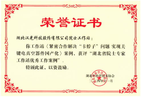 近日,公司收到了湖北省科學(xué)技術(shù)協(xié)會頒發(fā)的“榮譽證書”,公司院士工作站《緊密合作解決“卡脖子”問題 實現(xiàn)關(guān)鍵電真空器件國產(chǎn)化》案例獲評“湖北省院士專家工作站優(yōu)秀工作案例”。