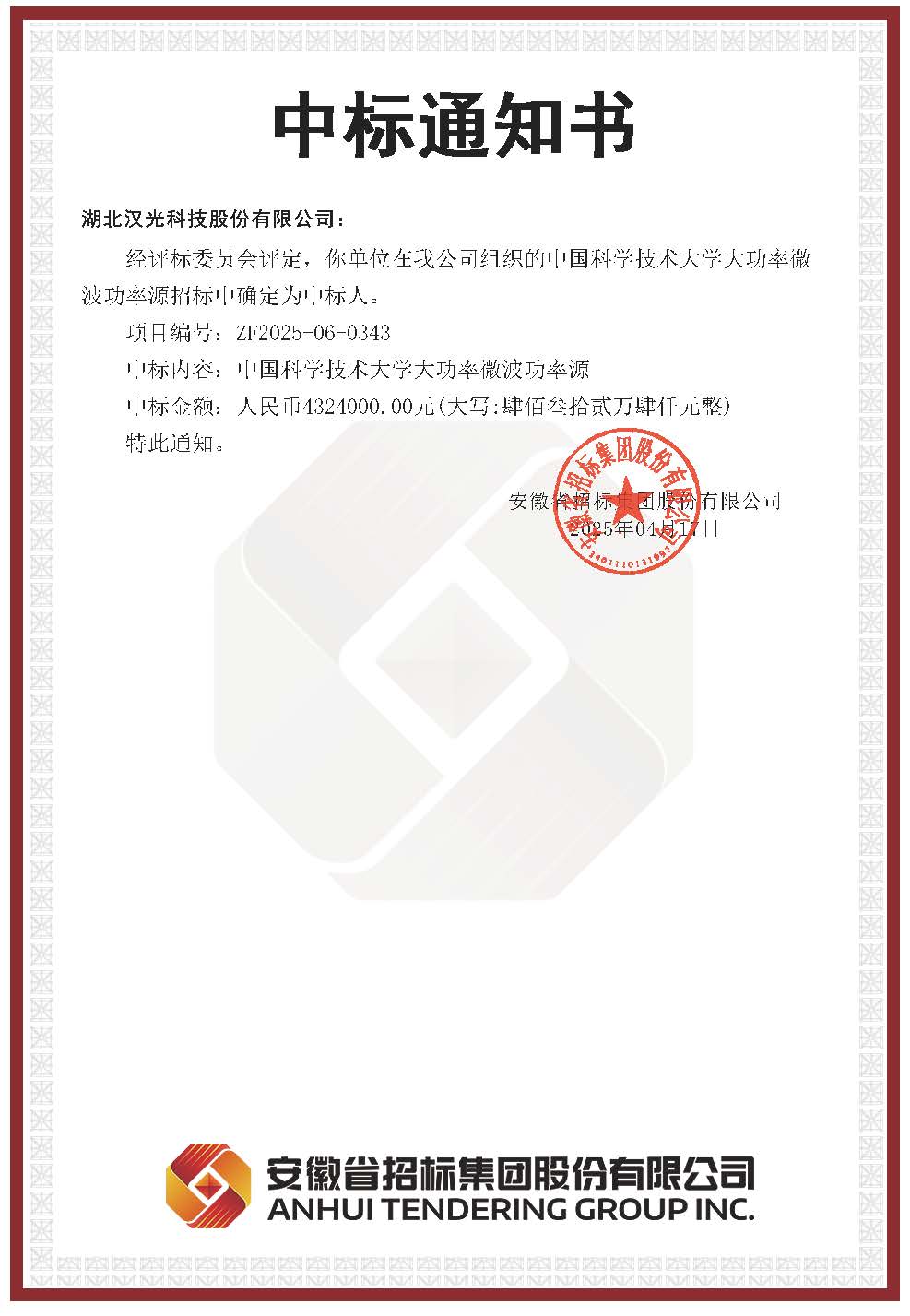 近日,公司收到安徽省招標(biāo)集團(tuán)股份有限公司發(fā)來的中標(biāo)通知書,公司成功中標(biāo)中國科學(xué)技術(shù)大學(xué)4套大功率微波功率源,中標(biāo)金額總計(jì)432.4萬元。