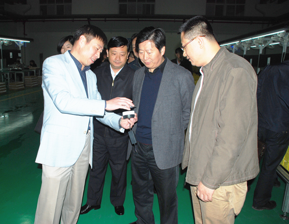 仇平貴聽取公司董事長梅祖軍(左1)LED照明產(chǎn)品的匯報(bào)。