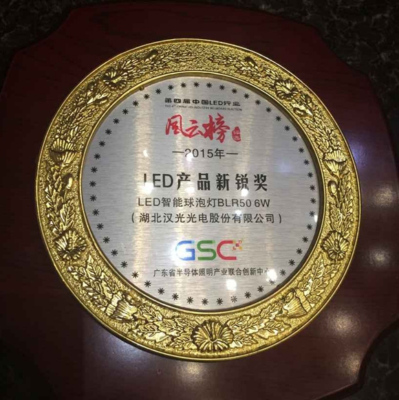 2015年10月19日,第四屆中國LED行業(yè)風(fēng)云榜頒獎晚會在廣東惠州舉行。經(jīng)過為期一個月的專家評審、網(wǎng)上投票及終評環(huán)節(jié),由漢光光電研發(fā)生產(chǎn)的LED智能球泡燈 BLR50 6W最終贏得“LED產(chǎn)品新銳獎”榮譽。