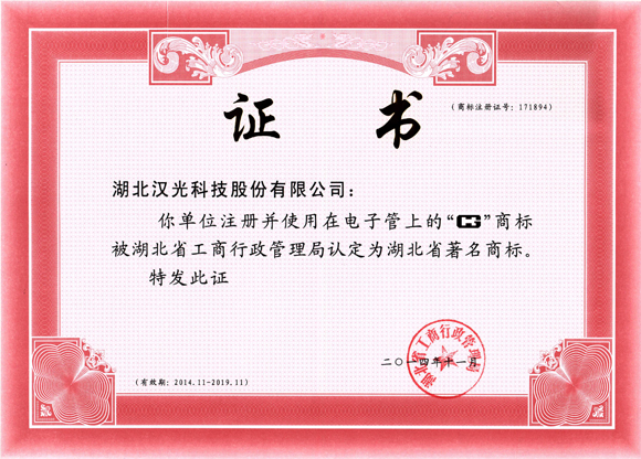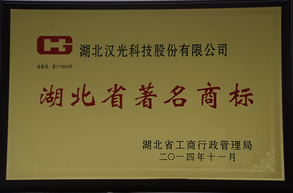 2014年11月,繼“三工”商標之后,我公司由漢光的拼音字母HG組成的圖案商標繼續(xù)被認定為湖北省著名商標。