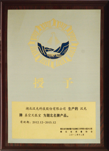 2012年12月30日,我公司“漢光”牌真空滅弧室被湖北省實施質(zhì)量興省戰(zhàn)略工作領導小組辦公室、湖北省質(zhì)量協(xié)會評為2012年度“湖北名牌”產(chǎn)品稱號。